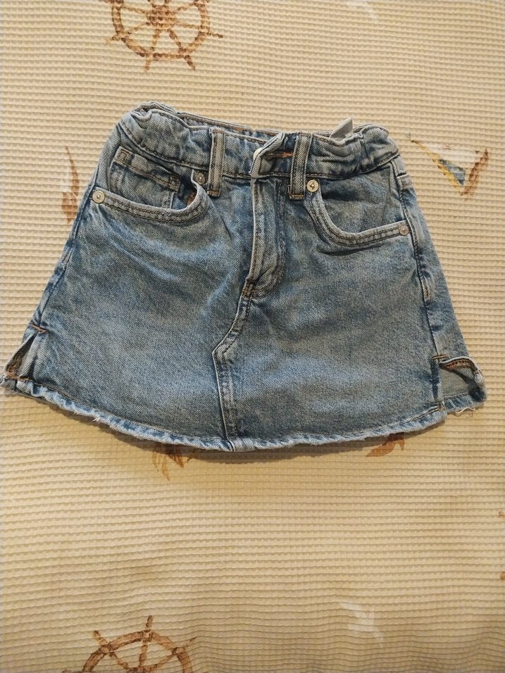 mavi kot kız çocuk eteği. Ön cepli ve etek ucu detayına sahip sokak stili şortetek.