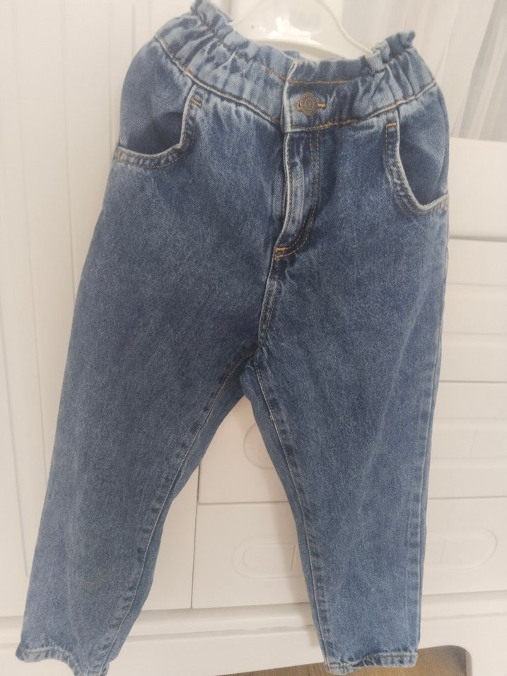 Mavi-gri tonlarda, kemer tokalı bel kısmı ve bol kesimiyle kızlar için kot pantolon. Sokak modasına uygun.