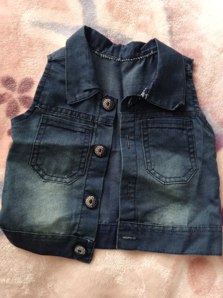 Koyu mavi, düğmeli, yaka detayı olan, kol kısmı açık, fitted kesim kız çocuk kot yelek. Trend sokak stiline uygun.