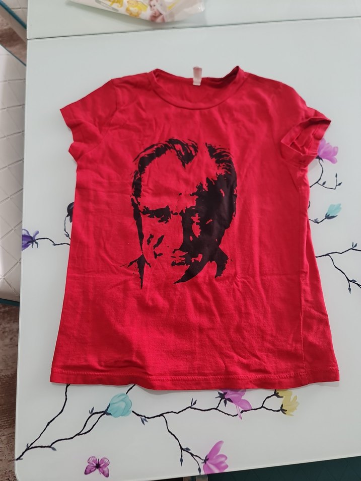 Koyu kırmızı renkte, pamuklu kumaştan yapılmış, baskılı ve bol kesim kız çocuk tişörtü. Kısa kollu ve yuvarlak yakalıdır.