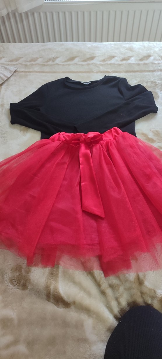 Koyu kırmızı, drapeli ve sentetik kumaştan yapılmış kız çocuk eteği, gotik tarzıyla dikkat çeker.