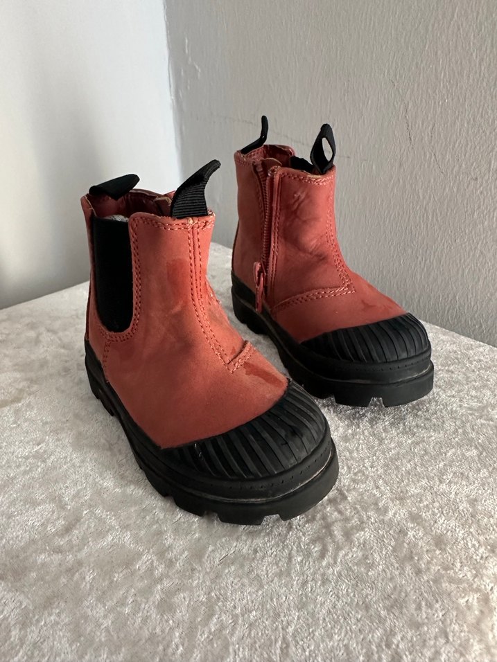 Koyu kırmızı kauçuk kız çocuk botları, cırt cırtlı kapanış ve siyah takviyeli burun detaylı, normcore tarzda rock punk havası taşıyor. Çok az kullanıldı temizlenip gönderilecek yeni gibi