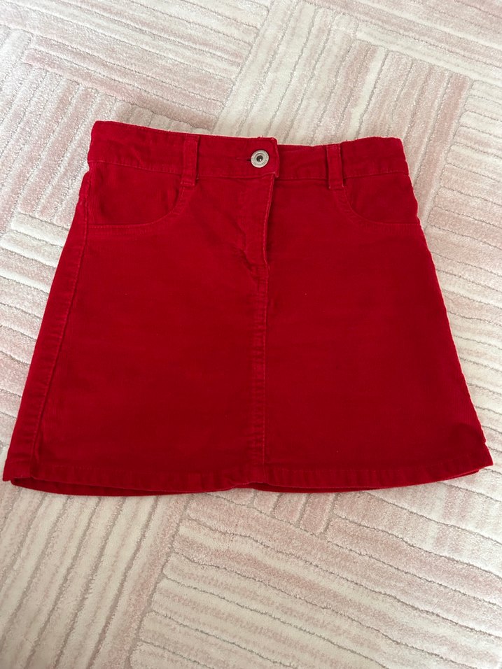 Koyu kırmızı renkli, süet kumaştan yapılmış kız çocuk etek, düğmeli ve dar kesimdir. Düz ve desensiz tasarımıyla sokak modasına uygundur.