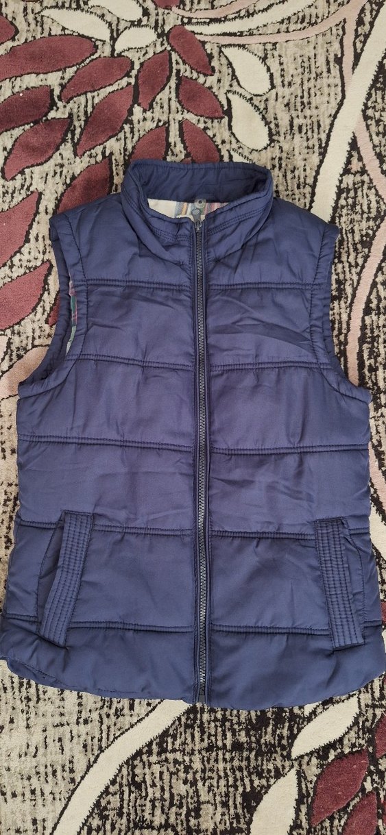 Koyu mavi, fermuarlı ve kolsuz kız çocuk yeleği, düz ve dar kesim. Trend sokak giyimine uygun, sentetik kumaştan yapıldı.