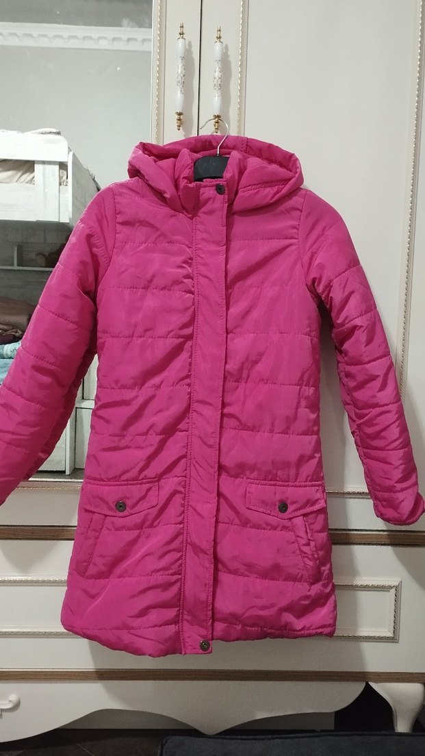 Koyu pembe renkli, düğmeli ve kapüşonlu kız çocuk kabanı. Yumuşak ve sıcak kumaştan, sokak tarzı için uygun, kesimi vücuda oturur.