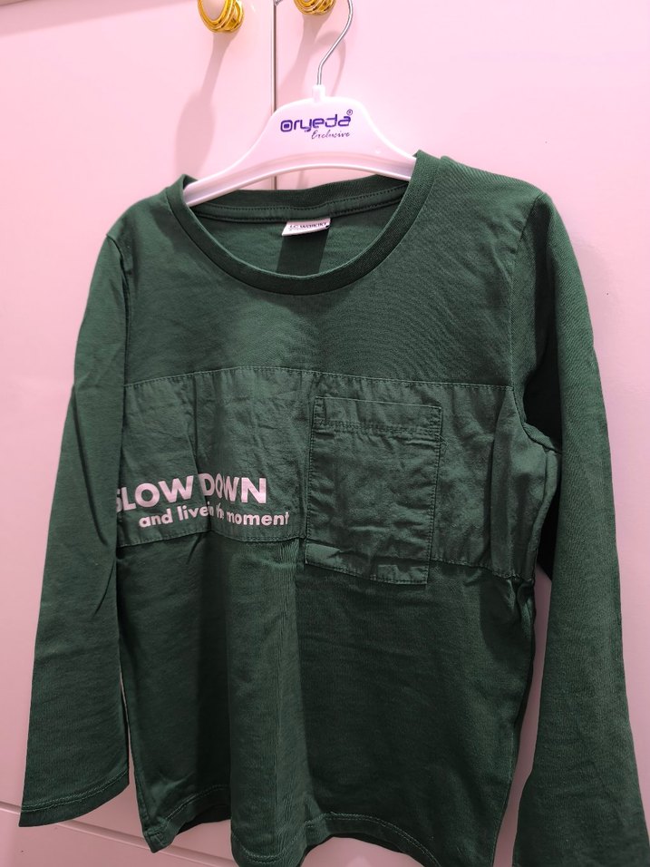 Koyu yeşil, uzun kollu kız çocuk tişörtü, yuvarlak yaka ve bol kesimlidir. Pamuklu yumuşak kumaştan olup, 'iLOWDONN' baskılıdır.