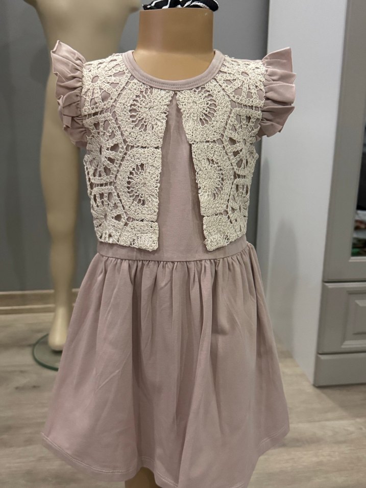 Krem dantel detaylı, kolsuz ve işlemeli bohem tarzda, vücuda oturan örgü kumaştan kız çocuk elbisesi. Yuvarlak yakalı ve fırfırlı kolludur.