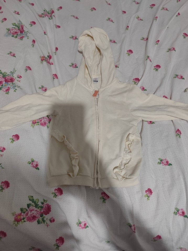 Krem renkli kız çocuk sweatshirt, kapüşonlu ve fermuarlıdır. Yumuşak ve sıcak kumaştan yapılmış, uzun kollu ve ön ceplerinde fırfır detayları bulunur.