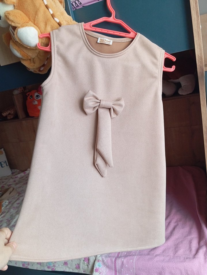 Kolsuz, yuvarlak yakalı krem elbise, önünde fiyonk detayı bulunur. Yumuşak sentetik kumaştan üretilmiş, vücuda oturan kesim. 7.8yas hiç giyilmedi