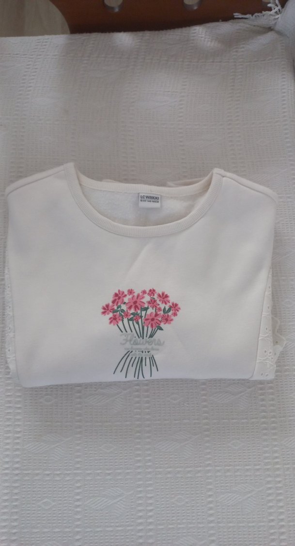 10-11 yaş lcw.Pamuklu, yuvarlak yakalı kız çocuk beyaz, nakışlı pembe çiçekli ve dantel detaylı, bol kesim. İçi hafif yünlü. az giyildi. çok şık