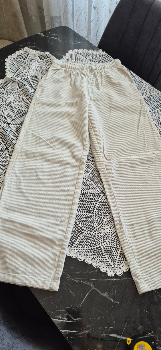 kız cocugu için midi boy, bol kesim, hafif krem pamuklu pantolon. Günlük kullanıma uygun rahat ve şık bir görünüm sunar.