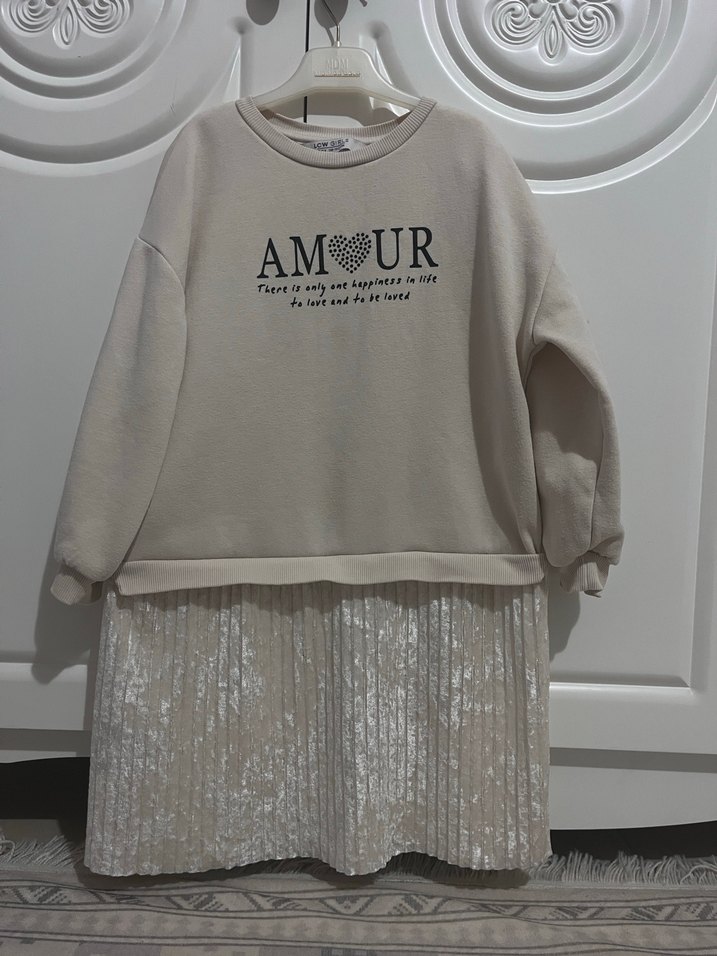 Pamuklu, uzun kollu, krem renk kız çocuk sweatshirtlü elbise. Üzerinde "AMOUR" baskısı ve pileli detaylar bulunur. Rahat ve şık bir günlük stil sunar. 6-7 yaş