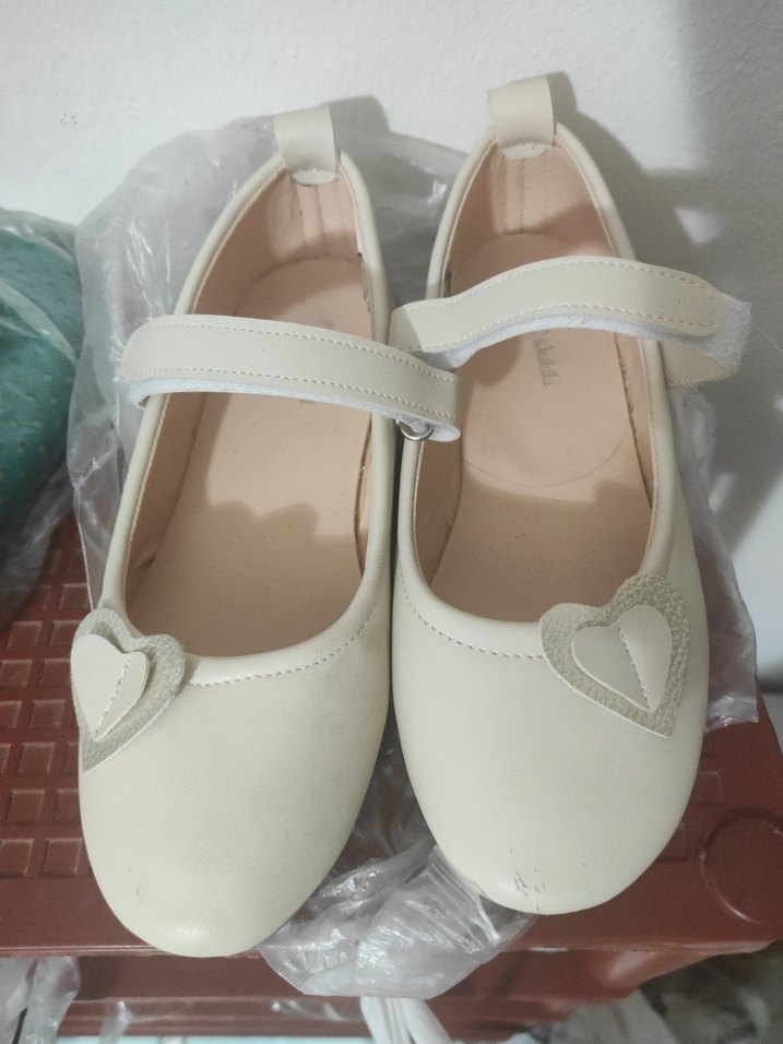 Beyaz, tokalı bantlı ve kalpli detaylı kız çocuk babet ayakkabısı, kauçuk malzemeden üretilmiştir. ayrıntılı resimler vardır