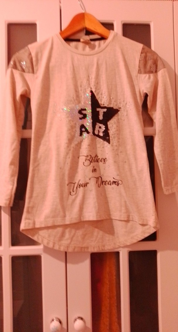 krem uzun kollu kız tişörtü, bol kesim ve bisiklet yaka ile. Parlak detaylı yıldız baskısı ve 'Believe in Your Dreams' yazısı bulunur. Yumuşak sentetik kumaştan, trend sokak stili için uygundur. ✨