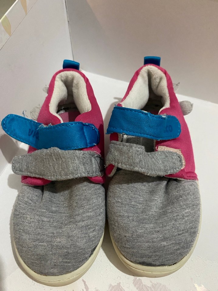 Kız çocukları için gri kürk görünümlü kumaştan, mavi ve pembe detaylı, cırt cırtlı spor ayakkabılar. Rahat ve günlük kullanıma uygun.