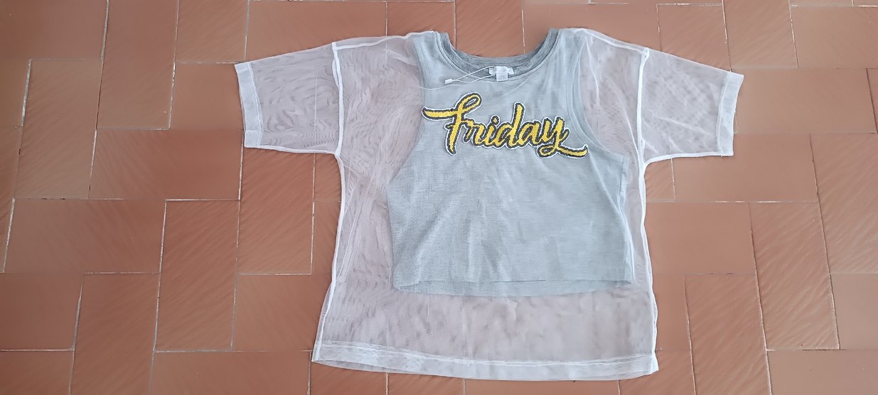 Hiç bir sorunu yoktur giyilmemistir.Fotografda yakasındaki etiket ipi bile durmakdadir etiketi koptu kizima olmadığı için satiyorum Kız çocuk gri renkli, crop fileli tişört Likralidir straplez yaka, kısa kollu, bol kesim tişört. Üzerinde 'friday' yazısı baskılı ve dantel detaylıdır.10 _11 yaş yazar ama 9 yaşındaki 10 yasa uygundur
