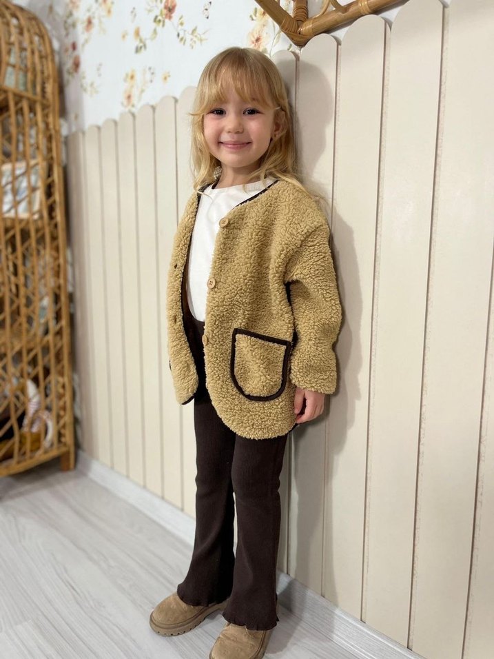 Kız çocukları için kürk detaylı, açık kahverengi, kesim yaka ve rahat kalıplı yumuşak ve sıcak dokulu ceket. Fitilli pamuklu Tayt esnektir. 3-10 yaş seçenekleri mevcut