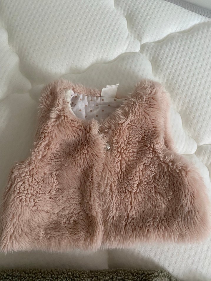 Kız çocukları için yumuşak bej kürk detaylı, askısız yakalı ve sıcak polar kumaştan yapılmış kolsuz yelek.
