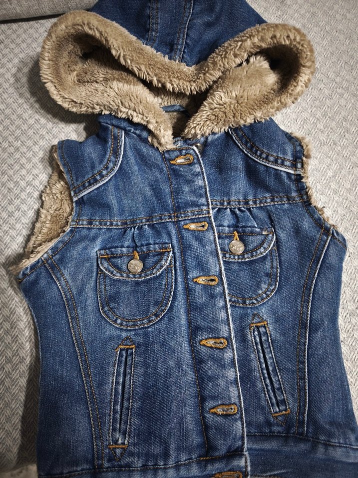 Kız Çocuk Kürklü Kapüşonlu Denim Yelek