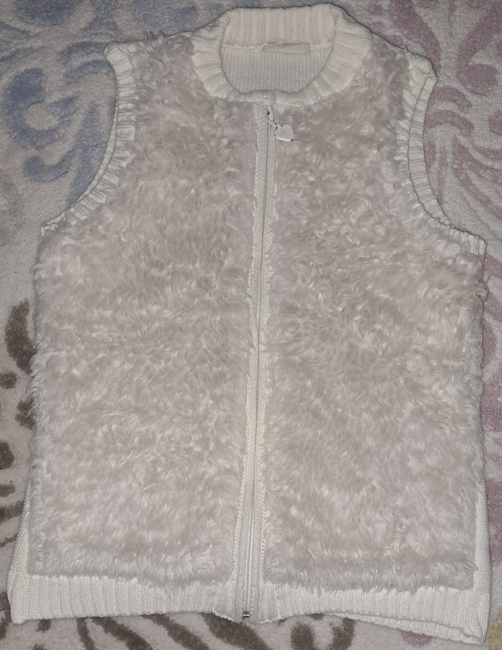 Kız çocukları için krem renk, kolsuz, kürk detaylı ve dar kesim yelek. Sokak stiline uygun rahat bir parça.