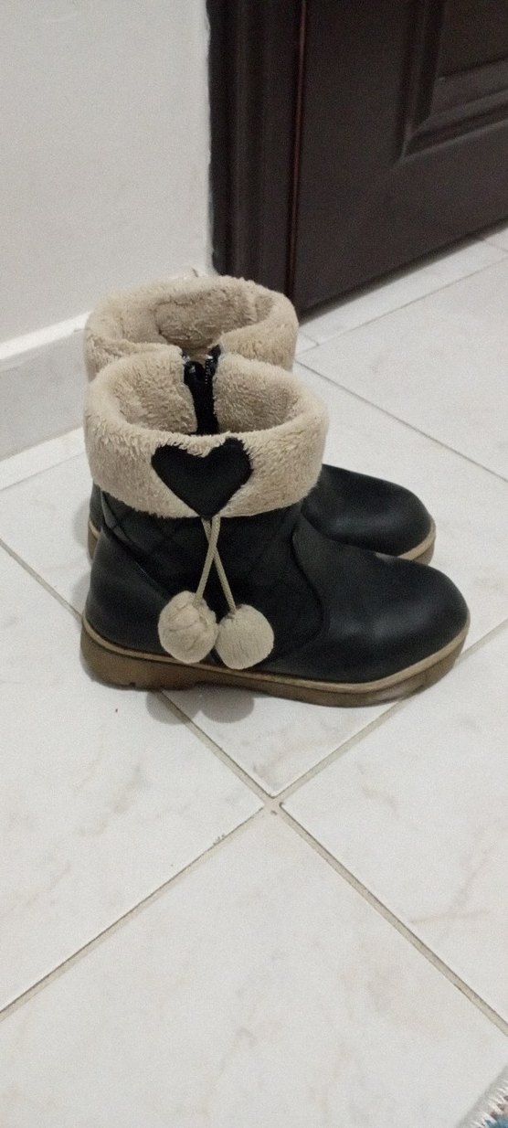 Kız çocukları için siyah botlar, kürklü iç detay ve kalp süslemeli tasarımla rahat ve şık bir görünüm sunar. Az kullandık ponpon kısmı düşmüştü ben zincir şeklinde ekledim. Başka sorun yok.