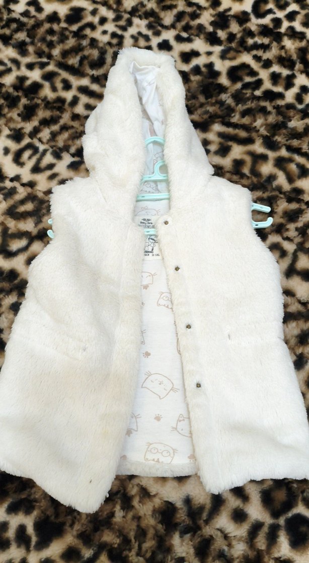 Kapüşonlu, kolsuz beyaz yelek, yumuşak kürk detaylıdır.