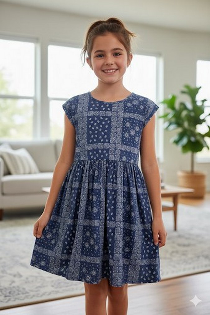 Kız Çocuk Lacivert Bağlama Desenli Denim Elbise
