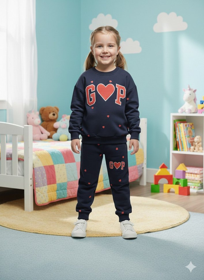 Lacivert renkli kız çocuk eşofman takımı, bol kesim, uzun kollu ve yuvarlak yaka. Yumuşak ve sıcak kumaştan, baskılı kalp desenli ve cırt cırtlı detaylıdır. Trend sokak stili için uygun.