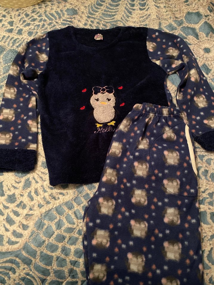 Kız çocukları için uzun kollu, yuvarlak yakalı, yumuşak ve sıcak kumaştan lacivert renkli, örgü dokulu baykuş baskılı pijama takımı.
