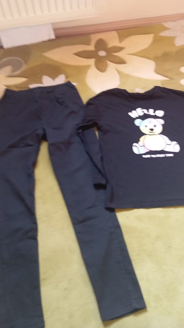 Koyu mavi uzun kollu, ayıcık baskılı sweatshirt ve bol kesim pantolon. Yuvarlak yaka ve trend bir günlük tarz sunar.
