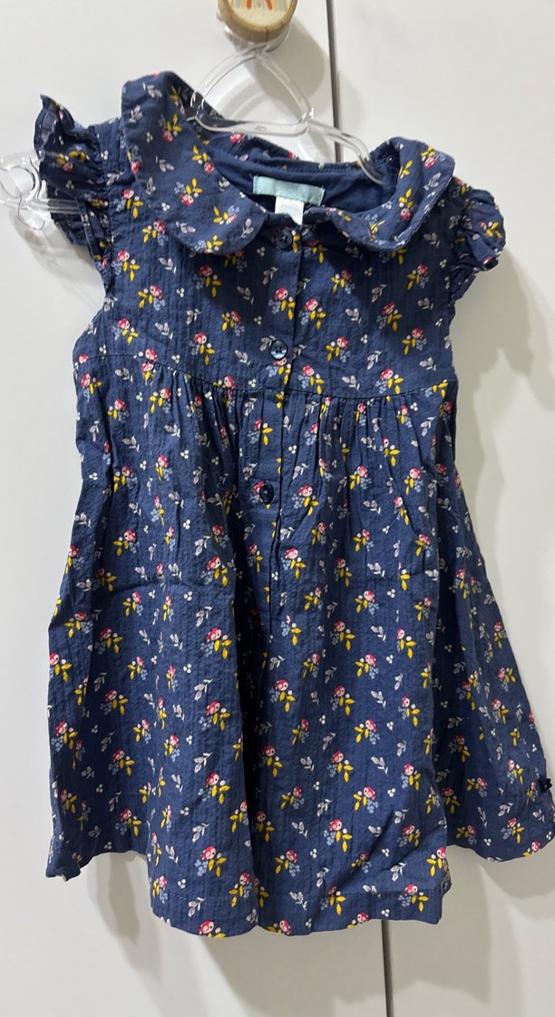 Kız çocukları için lacivert, çiçekli desenli, kolsuz ve bol kesim elbise. Yaka ve fırfır detayları bulunur, bohem tarzındadır. Yurtdışından gelmiştir