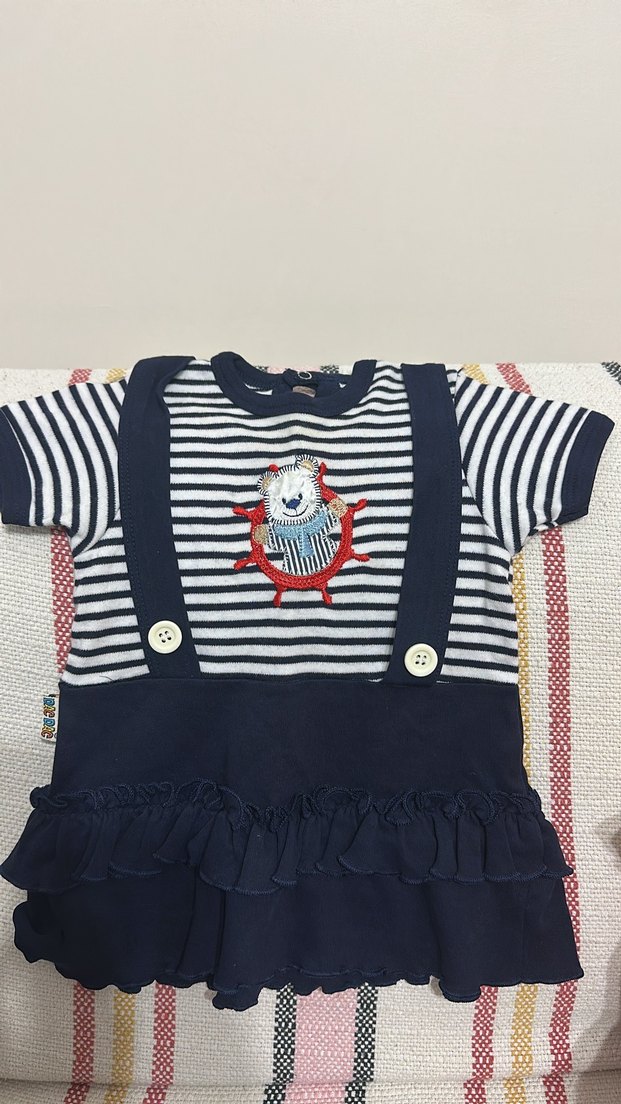Kısa kollu, bisiklet yaka ve fitted kesime sahip kız çocuk elbise Lacivert ve beyaz çizgili, etek kısmında fırfır detayı bulunur. Yumuşacık %100 koton kumaş triko defosuz temiz