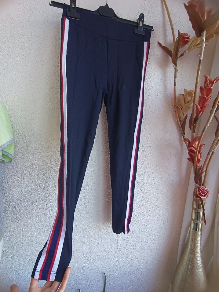 Kız çocukları için elastik bel bantlı, yanları çizgili lacivert streç tayt. Rahat sentetik kumaştan, trend sokak stili için uygundur.