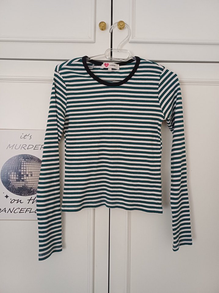 Kız çocuklar için lacivert çizgili, uzun kollu, bisiklet yaka ve ince dokuma pamuklu kumaştan yapılmış, sokak modasına uygun bir tişört.