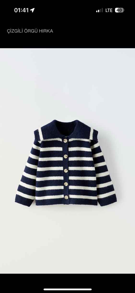 Bu örgü lacivert kız çocuk hırka, uzun kollu ve fitted kesime sahiptir, yumuşak yünden yapılmış çizgili desene sahiptir. Hiçbir kusuru yoktur. Yeni alınmış gibidir.