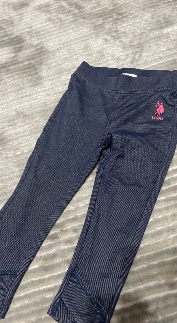 Kız çocukları için lacivert dar kesim denim pantolon, baskılı desen ve fermuarlı detaylara sahip, trend sokak stili için uygun.