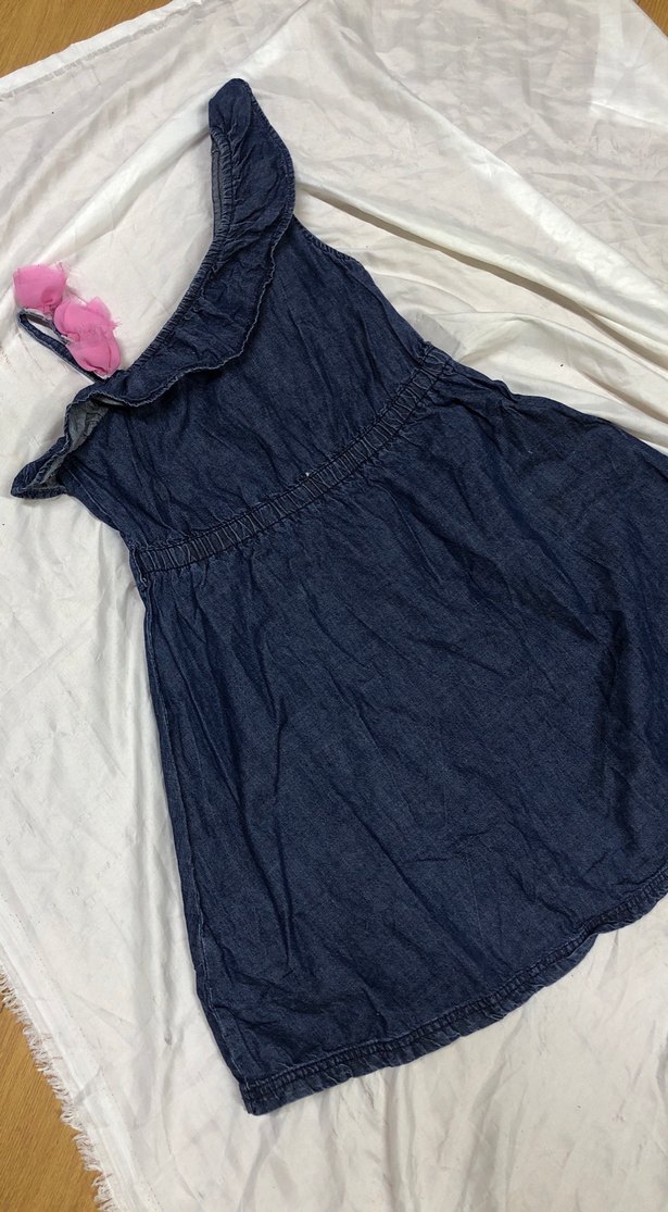 Lacivert denim kumaştan, askısız ve fırfırlı detaylı, bol kesim kız çocuk elbisesi. Rahat sokak stili için uygundur.