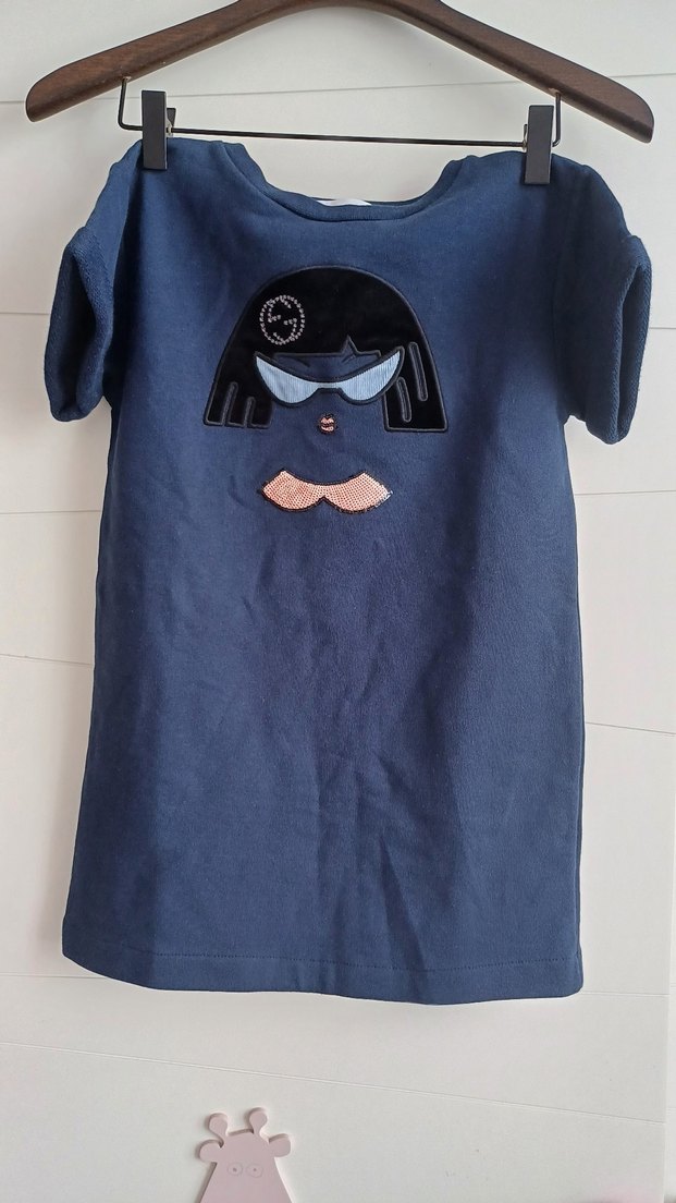 Lacivert renkli, kısa kollu, yuvarlak yaka, bol kesim kız çocuk tişörtü. Denim kumaş üzerine gotik tarzda baskı ile şık görünüyor.