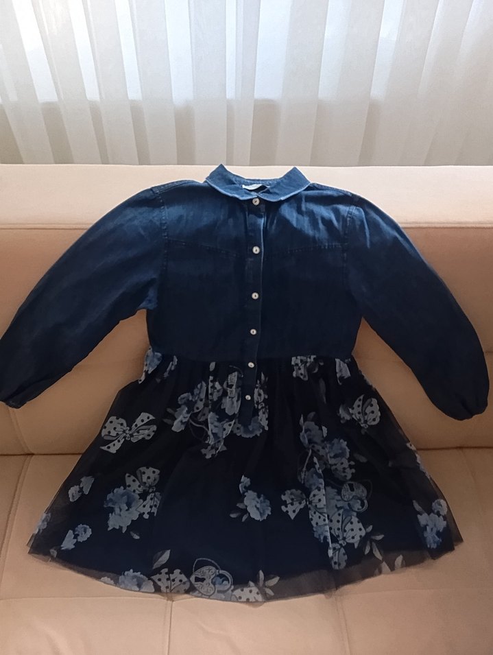 Lacivert uzun kollu, düğmeli, yakalı denim kız çocuk elbisesi. Bol kesim ve çiçek desenli etek kısmı bohem tarzı yansıtıyor. boyu 80 cm bel kısmı 68cm