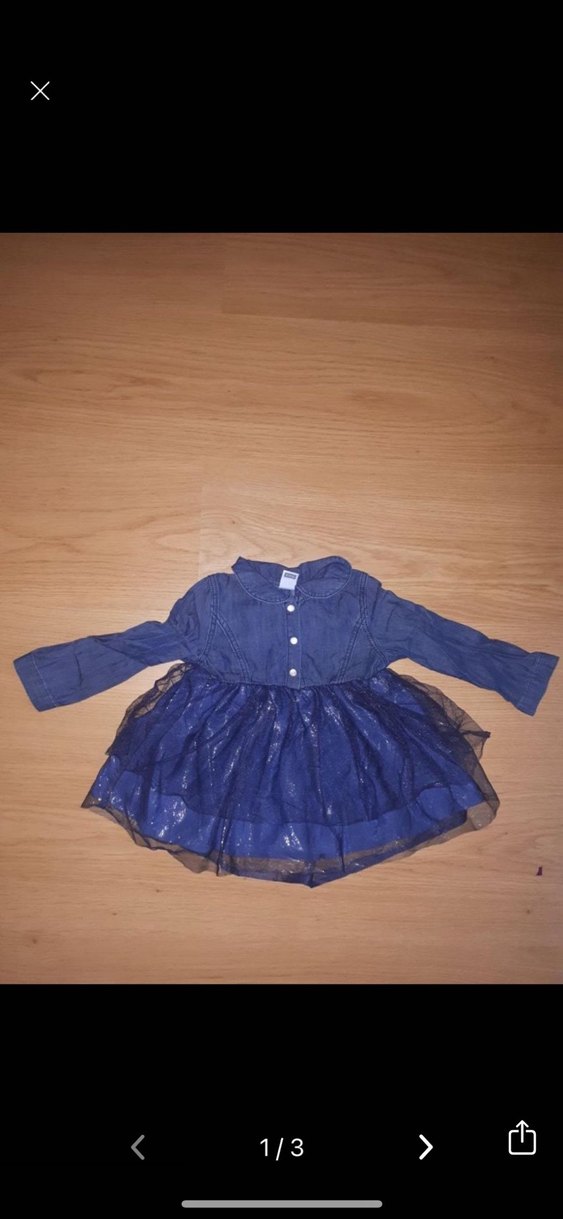 Kız çocuk lacivert denim elbise, uzun kollu ve yakalıdır. Bol kesim olup etek kısmında tül detaylı fırfır bulunur. Desensiz ve koyu renklidir. Yırtığı söküğü hiç bir kusuru yoktur