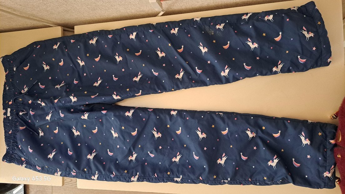 Kız çocukları için lacivert, dar kesim pantolon, tokalı detaylı, yumuşak sentetik kumaş üzerine unicorn ve yıldız desenli.