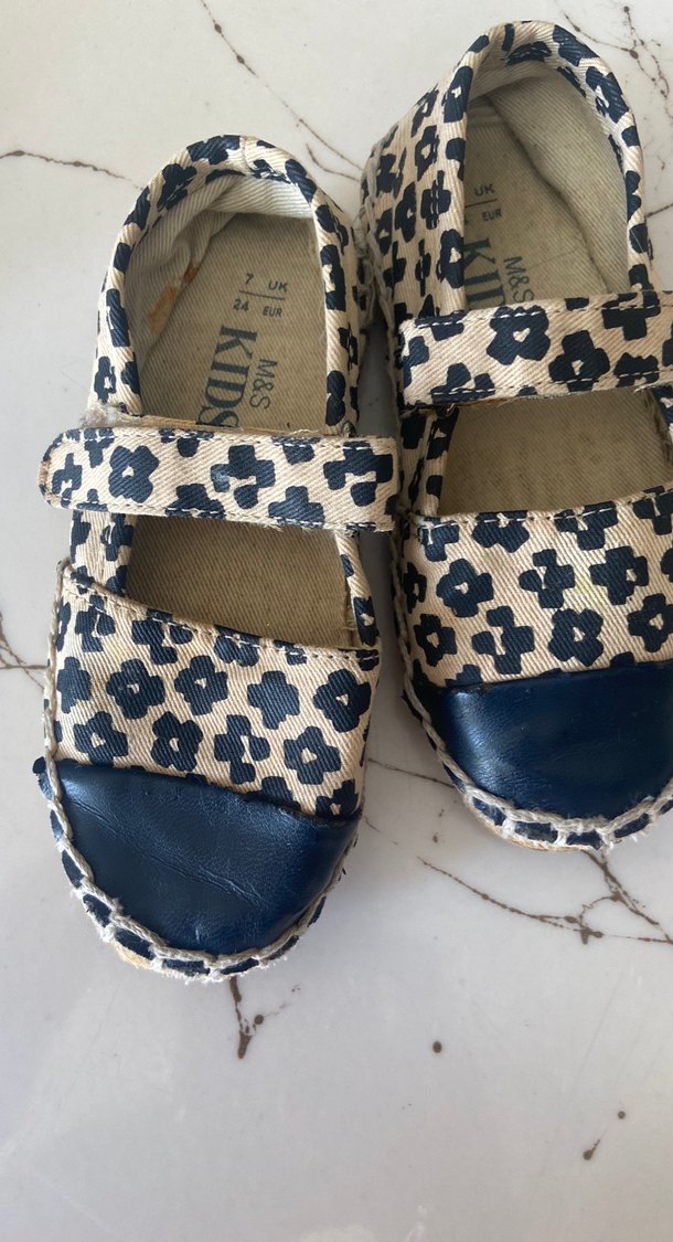 Kız çocukları için lacivert baskılı, tokalı bantlı ve kauçuk detaylı bohem tarzda babetler.