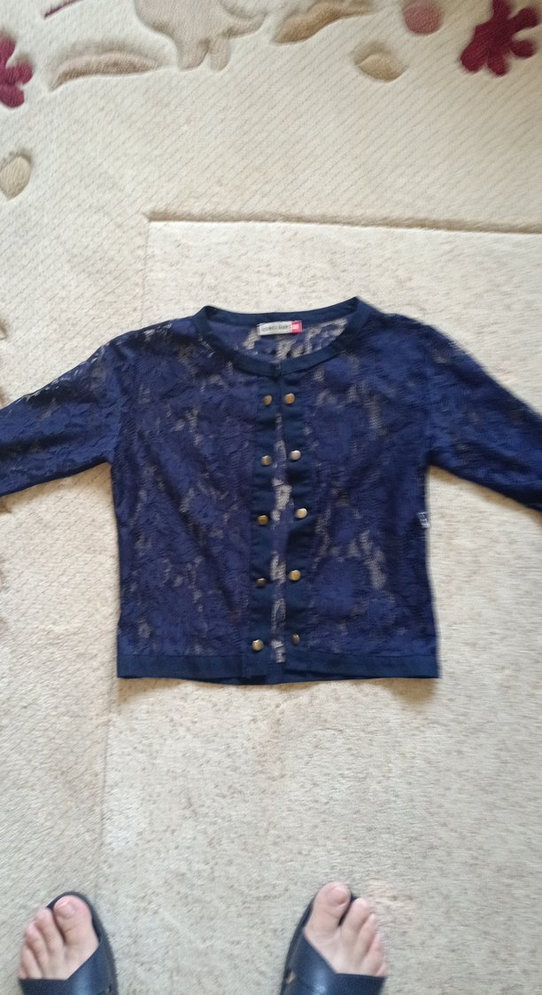 Kız çocukları için uzun kollu, düğmeli lacivert denim bolero. Bohem tarzda, yuvarlk yaka ve bol kesimle tasarlanmıştır. 36 beden 12 13 yaş