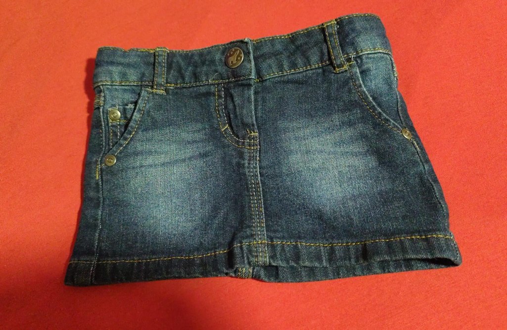 Koyu mavi düğmeli kot kumaştan yapılmış, kız çocukları için dar kesim etek. Desensiz ve günlük şıklık için uygun.