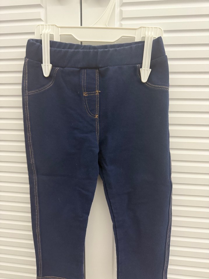 Lacivert renkte, elastik bel bantlı kız çocukları için dar kesim denim pantolon. Desensiz ve rahat. Bir kez süveterle kullanılmıştır.