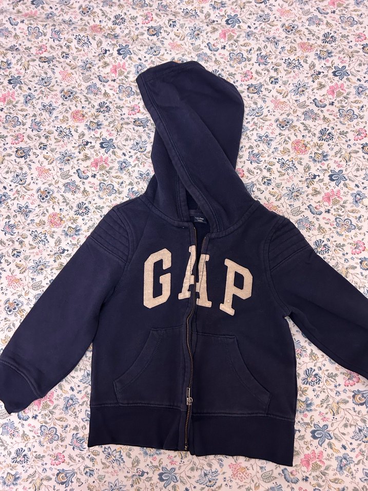 Kız çocukları için fermuarlı, kapüşonlu ve uzun kollu, yumuşak kumaştan yapılmış lacivert sweatshirt. GAP baskılı ve rahat kesimli, günlük stil için uygun.