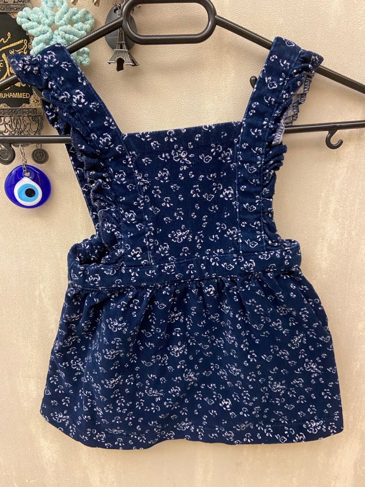 Kız çocuklar için fırfırlı askılı, baskılı bohem tarzda lacivert denim elbise.