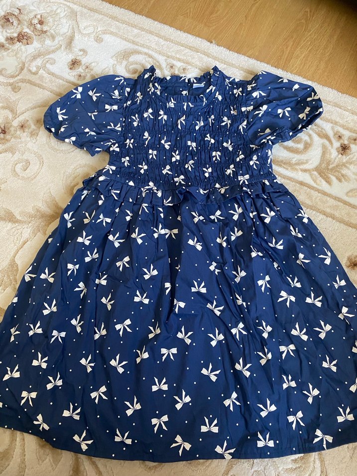 Sentetik kumaştan, kısa kollu ve straplez yaka detaylı, bol kesim kız çocuk elbisesi. Lacivert zemin üzerinde beyaz fiyonk desenleri ve fırfır detayı bulunur.