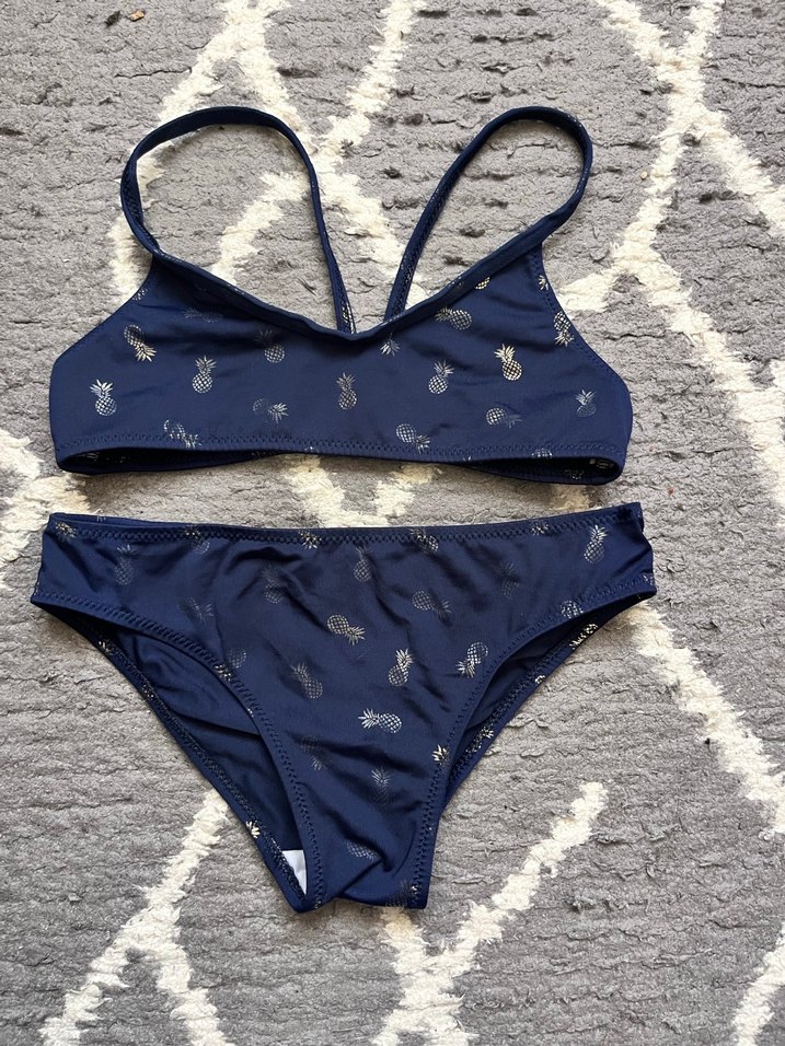 Lacivert ince askılı bikini, hafif ananas desenli, plajda rahat kullanım için yumuşak kumaştan üretilmiştir. H&M den alındı ama etiketi kesildi kaliteli ürün