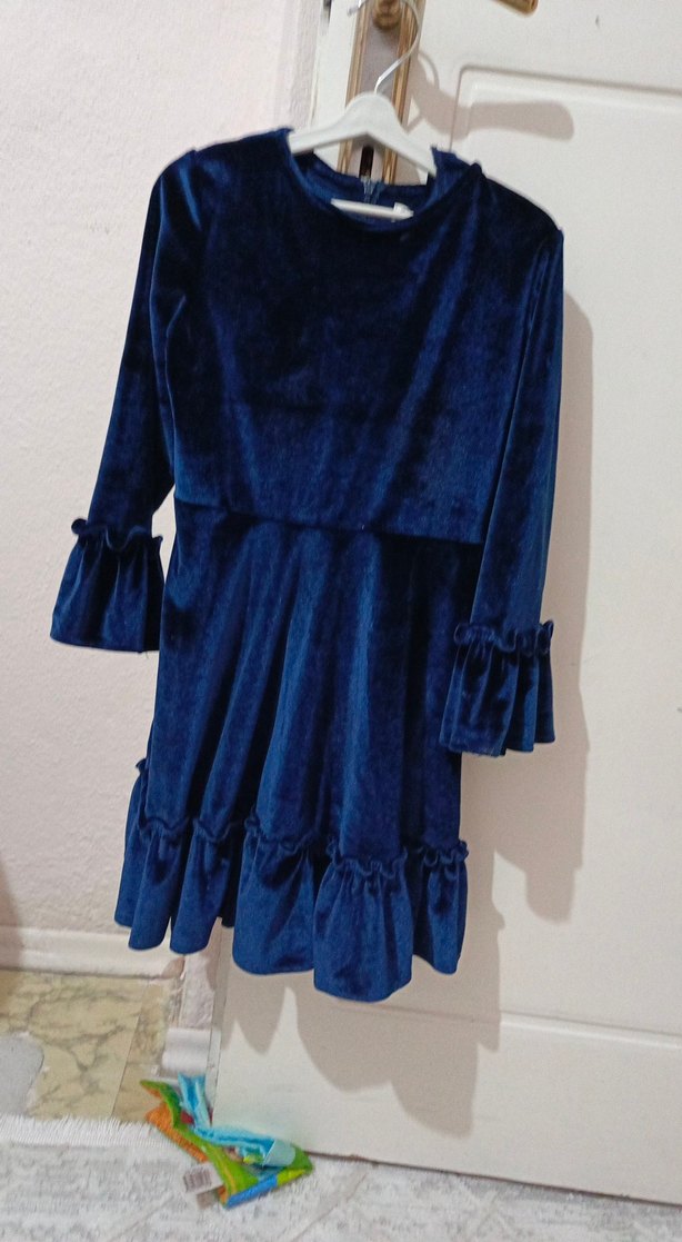 Koyu mavi kadife kumaştan, uzun kollu ve fırfırlı detaylı, fitted kesim kız çocuk elbisesi. Retro goth tarzında, bohem ve hippie görünüme uygun.